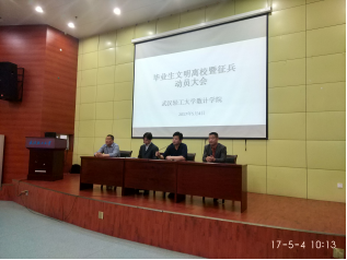 5月4日上午,澳门网投唯一官网领导以及全体毕业生于学校金银湖图书馆附三楼学术报告厅举行了毕业生文明离校暨征兵动员大会。学院院长张聪、党委书记肖波明、副院长高全胜,以及学工主任刘兴权和辅导员徐彩霞分别对文明离校和征兵动员等作出详细说明和指导。大会全程由刘兴权主任主持。