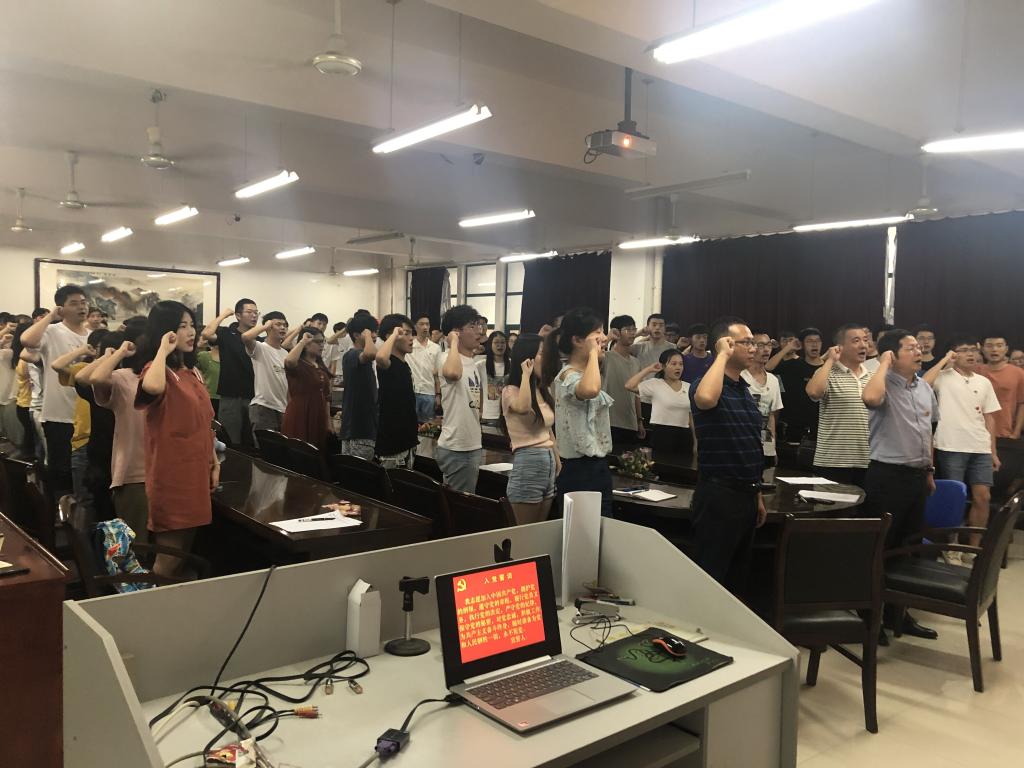 会议第三项,副书记谢慧荣带领全体党员宣誓。全体党员举起右拳,面对党徽大声诵读入党誓词,表达了为共产主义事业奋斗终身的理想和信念。