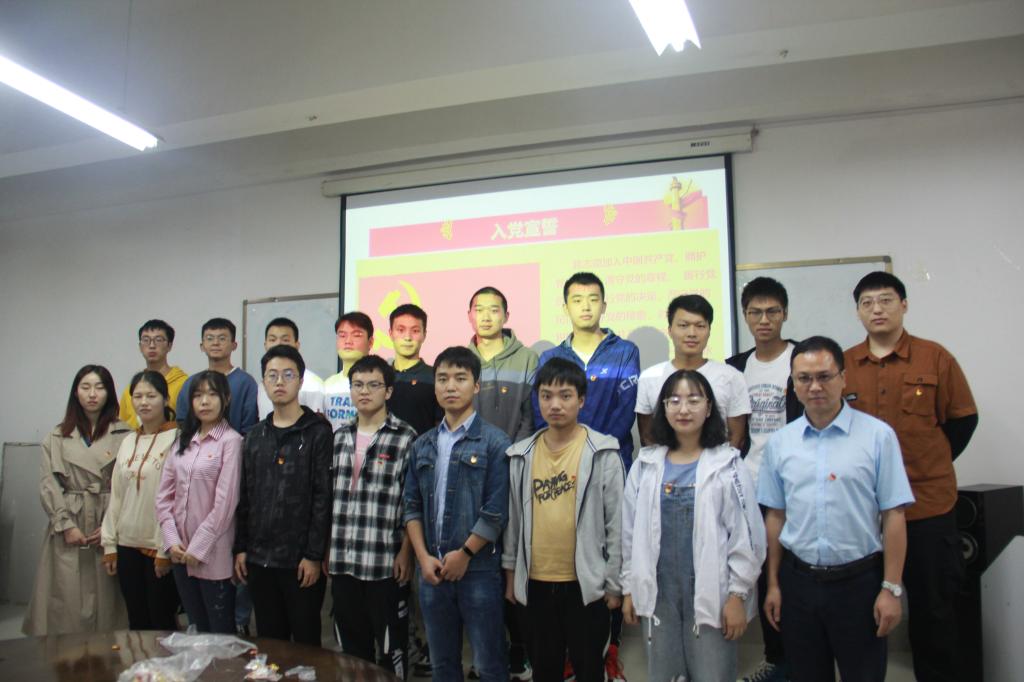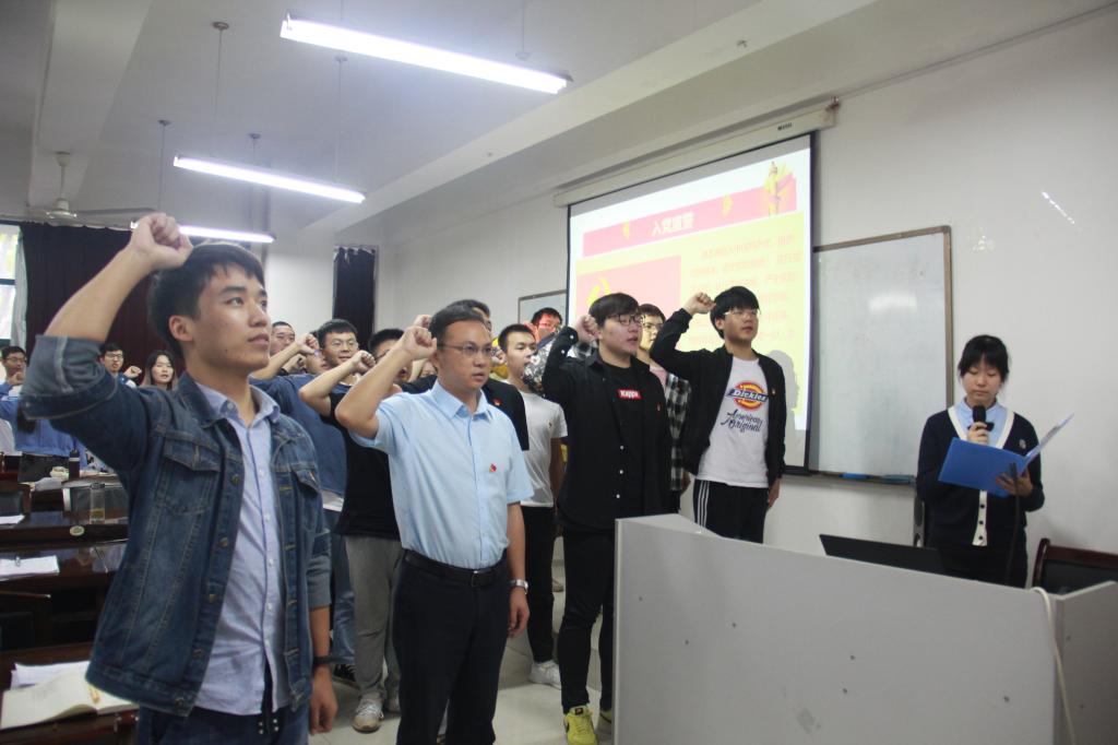 会议最后,学院党委副书记谢老师与8名入党介绍人一起为20名新党员佩戴党徽,并举行了入党宣誓仪式。