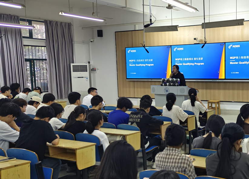 为进一步做好学生考研、升学及出国规划指导,深入推进中外合作办学项目实施,澳门网投唯一官网于5月22日晚在励志楼102室举办MQP硕士衔接项目宣讲会。AEMG教育集团招生部副部长宝力高部长担任主讲,数计学院副院长李雅琴、国际教育学院副院长陈德胜、MQP项目分部副主任魏雪参加宣讲活动,数计学院各年级学生共100余人参加本场讲座。