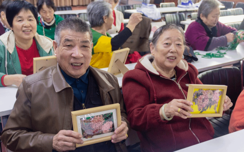 同学们带着象征重阳习俗的菊花与茱萸材料,与老人们结对而坐。“李奶奶,茱萸有辟邪祝福的寓意,菊花代表长寿安康,我们把秋天和祝福一起‘装’进画框里吧!”郑心瑜同学一边介绍,一边耐心地协助老人将片片茱萸叶与金色菊花搭配入框。