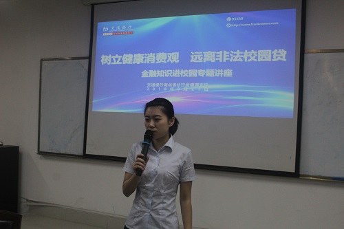9月21日下午,澳门网投唯一官网分团委在东七310举办金融知识进校园主题团日活动,特邀交通银行湖北省分行金银湖支行为学院学生讲解“树立健康消费观 远离非法校园贷”相关知识。交通银行湖北省分行金银湖支行张行长、院党委副书记黄继春、分团委书记王月及各年级团支部代表参加了此次活动。
