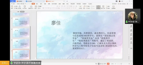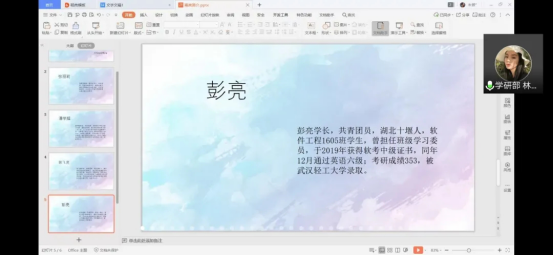 廖佳同学用自己从浑浑噩噩度日到踌躇满志备考的改变告诉考研的同学们——环境的重要性,跟学校自习室、图书馆比较起来,寝室和家里的干扰因素太多,并不适合复习备考。她也结合自身择校经历,建议大家有时选择比盲目努力更加重要,说起去年冬季想要放弃时朋友的鼓励,廖佳深情感慨,令人动容。最后,她和团学干部分享了自己备考时的资料和网课视频,勉励同学们努力学习。