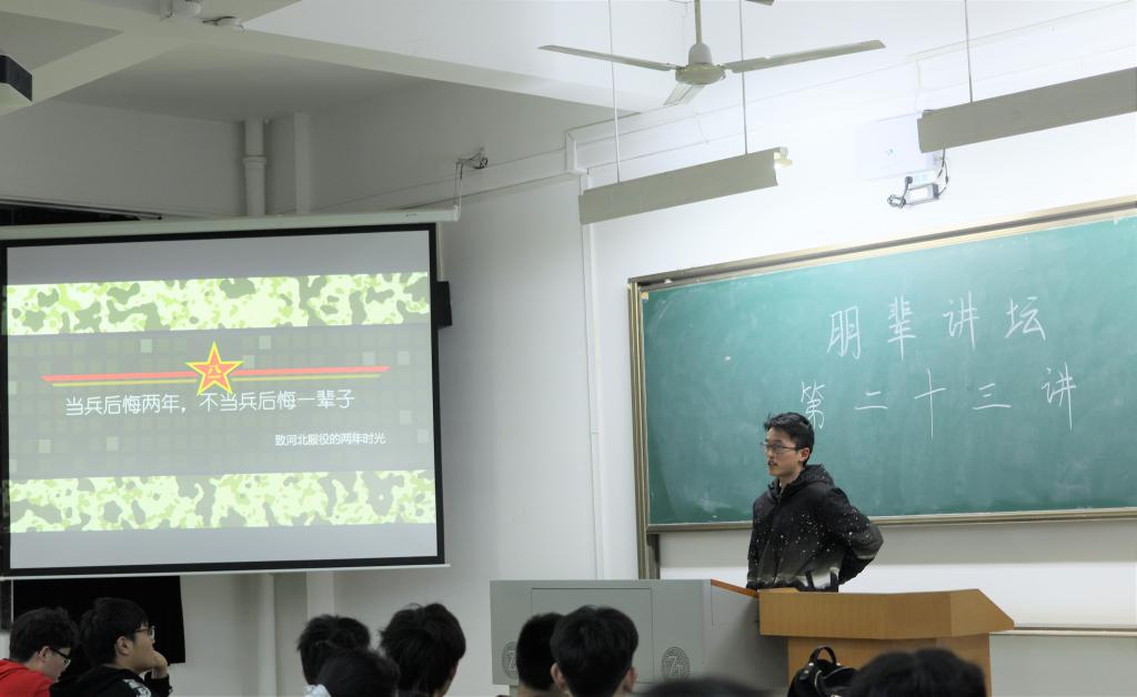 丁科同学来自信计1903班,他是一名光荣的退伍大学生,服役期间,曾荣获“优秀士兵”称号。“七天行军200多公里,平均每天步行30多公里,”站在讲台上,丁科深情地回忆了服役期间的故事,“很多人觉得这是不可能完成的任务,但军人的字典里从来就没有‘不可能’三个字!”丁科的个子并不高大,返校之后也戴上了近视眼镜,但现场的同学依然从他身上感受到了军人的力量。“部队见证了我的成长,我会把部队的优良传统带回学校。拿起枪是为了守护更多的人,放下枪也是如此。”讲座最后,他号召广大青年学生踊跃参军,报效祖国。