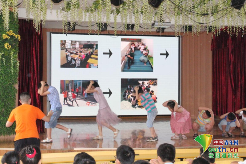 图为午晨旭带领格林斯学校的学生们做防震演练。中国青年网通讯员 余笛 摄
