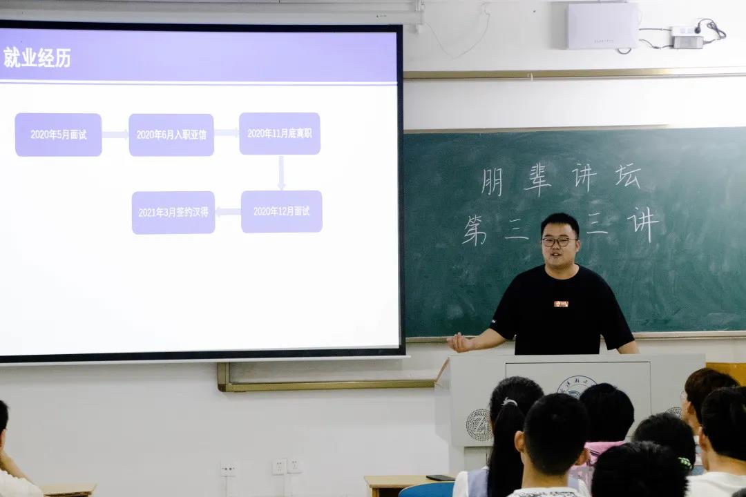 任小虎为学弟学妹们讲述了自己难忘的求职与实习经历。他提出的“早日确定考研还是就业”“尽早实习”“不惧面试,利用面试提升自己”“学会并善于利用牛客、CSDN等网站”等建议,令学弟学妹们获益匪浅。