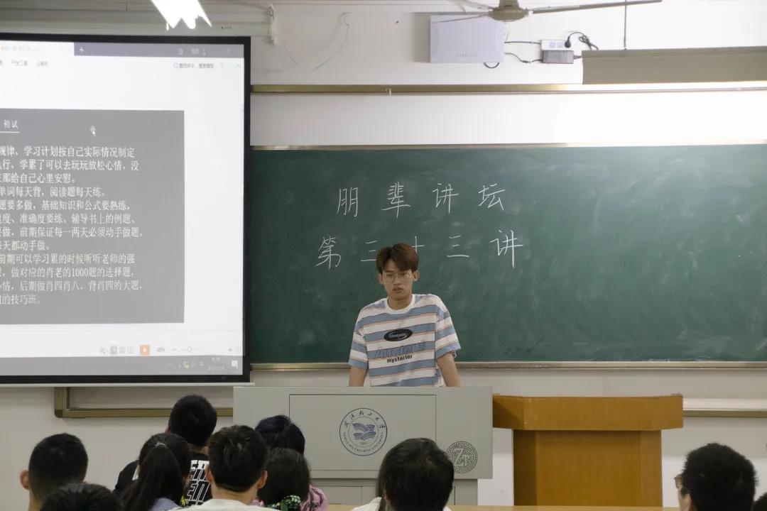 陈江涛向大家介绍了他丰富而充实的大学生活:大一转专业、大二与朋友去西安实习研究开发微商城、大三进入实验室参与开发微服务基础开发平台脚手架项目、大四考研上岸,他自律、充实、精彩的大学生活令学弟学妹们心生向往。关于考研,他对如何准备笔试和面试分别提出了自己的建议,他说,考研是一个漫长而辛苦的路程,要绵绵用力,久久为功,只要功夫下到了,成功也只是水到渠成的事情。
