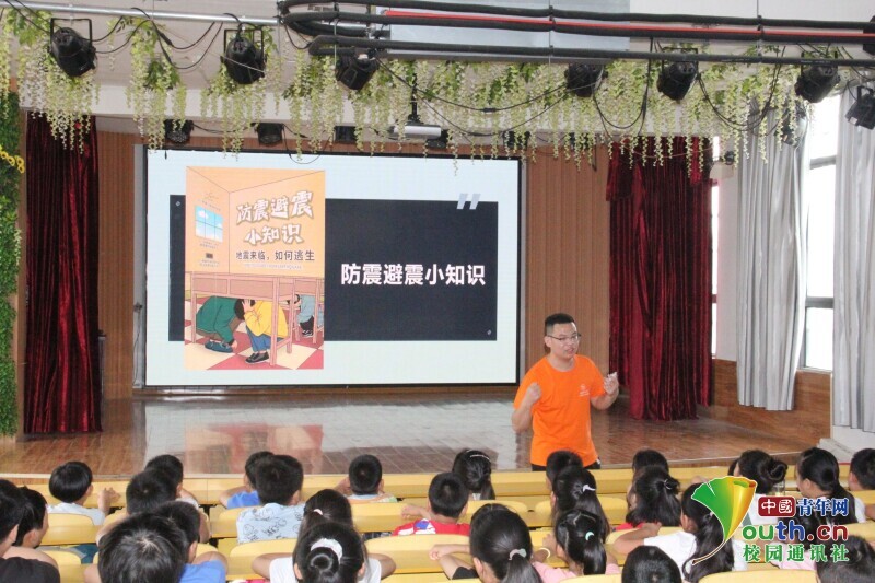 图为午晨旭给格林斯学校学生们讲解防震避震小知识。 中国青年网通讯员 余笛 摄