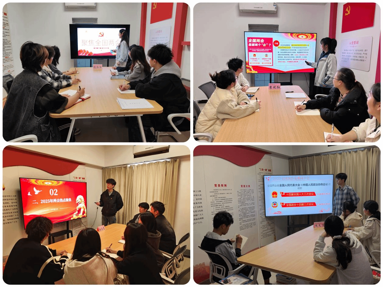 3月19日—24日,主席团成员杨晨晨、李悦红、谢添豫、张永康、周文涛分别在菽园2舍、禾园3舍等学生社区功能室,围绕政府工作报告中“数字经济”“深入实施科教兴国战略”“发展新质生产力”等核心议题,通过政策解读、案例研讨、实践对标等形式,推动全国“两会”精神学深悟透、见行见效,共同探讨了在当前新形势背景下,计算机专业学生如何结合专业所长,在专业领域不断深耕和创新实践,为国家的科技进步和经济发展贡献自己的智慧与力量。