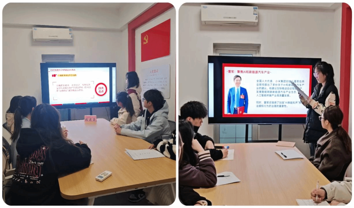 “今年开年国产大模型DeepSeek凭借开源模式和成本优势迅速‘出圈’,作为数计学子我们应该怎么看待这一事件?”3月18日,在菽园2舍省青马工程第11期党员张晶晶从DeepSeek引入,为大家讲述了全国“两会”代表们热议的新质生产力以及“人工智能+”行动。她用重庆全国人大代表王志杰带来的人工智能机器小狗的生动例子,带领同学们学习了“两会”上的新质生产力内容。她表示,作为学生会骨干要不断更新知识结构,锤炼实践与创新能力,在解决实际问题中会用、用好新技术,争当技术洪流中的排头兵。