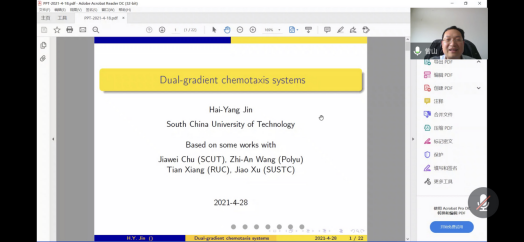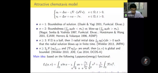 金海洋教授作了关于二重梯度趋化系统(chemotaxis systems )的学术报告。他主要介绍了生物趋化性、趋化系统对应的偏微分方程模型及其应用。强调了系统的方向性和lyapunov函数的重要性。雷远杰副教授介绍了从VPB系统到VPL 系统关于时间的全局收敛性。整个报告。他首先介绍于VPB系统,说明了VPB系统的全局适定性,再证明两个系统之间具有对数精度的全局时间极限。肖清华研究员介绍了具有相对论系统的Euler方程,Euler方程的非线性双曲波,以及满足熵条件下Riemann问题的解构成。