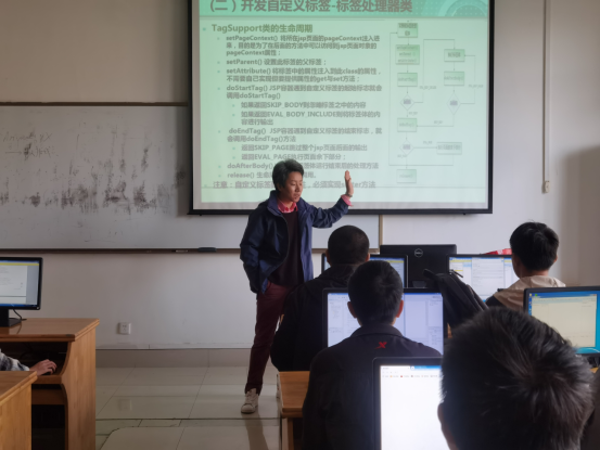 2020年10月26日,软件工程教研室教师观摩丁月华老师的《Web程序设计》课堂教学。本次课程授课内容为JSP自定义标签和标准标签库,丁月华老师通过案例引入的方式详细说明了JSP自定义标签的开发方法,通过代码示例深入浅出地说明了标准标签库的out、set、remove、if、choose、when、otherwise、forEach、forTokens等重要标签用法,让学生深入了解JSP标签简化JSP代码的作用。此外,丁月华老师利用超星学习通开展电子签到提高课堂管理效率,同时使用课堂练习等互动环节巩固学生知识的掌握。