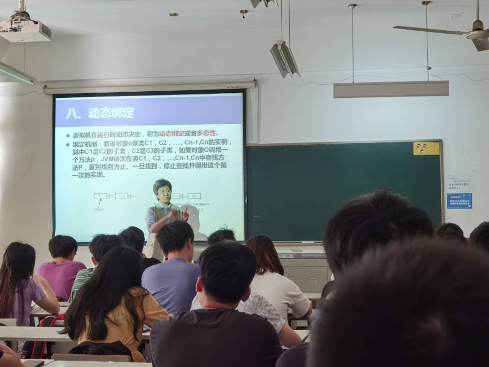2022年4月7日,软件工程系教师观摩丁月华老师的《Java程序设计》思政公开课。本次课程授课内容为继承和多态。继承和多态是面向对象程序设计的精髓,掌握好了对面向对象编程泛型的理解会更加透彻。丁月华老师通过“透过现象看本质”的思想,让大家多理解多态行为的本质。多态看起来灵活多变较为复杂,其实本质就是子类行为可以呈现多种不同实现形态。本次观摩课大家一致认为丁月华老师授课内容充实,条理清晰,重难点突出,教学方法适当,合理的融合了思政课教学思想。